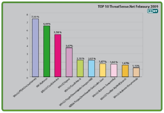 ESET的ThreatSense.Net® 提供一個可靠的惡意程式報告,仔細地分析最新的網絡威脅。最新的報告顯示,惡意程式Win32/psw.onlinegames再次成為最大的網絡威脅,它被偵測的百分比約佔病毒偵測總數的7.33%。在以下的報告中,我們會更詳細地分析和說明ThreatSense.Net®所偵測出來的十大威脅(包括上月排名和病毒偵測比率):