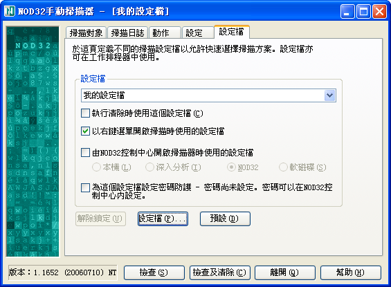 ESET NOD32本身已提供了相當細緻的查殺設置選項,只須打開每項功能的“設定”選項即可進行手動設置,靈活運用它們就可以滿足我們各種條件下的查殺需要,而且ESET NOD32允許你制定“設定檔”,可以針對不同的殺毒條件提前制定好各項查殺設置,這樣下一次再進行有針對性的殺毒操作時,只須調用對應的“設定檔”即可解決問題,而無須每次都手動進行選擇了。當打開“ESET NOD32手動掃瞄器”窗口後,根據不同條件下的需要,分別設置“動作”和“設定”標籤窗口中的各個查殺選項即可。然後切換到“設定檔”窗口中,依次點擊“設定檔/設定檔/新增”按鈕,在“新的設定檔名稱”框中為此設定的查殺選項輸入一個名稱,點擊“確定/離開”按鈕即可。接著在“設定檔”選框中選中新增的設定檔名稱,在下面的三個選框中為當前的“設定檔”提供三個執行操作,例如希望每次查殺病毒時都使用新增的設定檔,就鉤選“執行清除時使用這個設定檔”選框,如果只希望通過右鍵菜單調用這個設定檔,則只鉤選“以右鍵選單開啟掃瞄時使用的設定檔”選框等等(如圖),你可以根據自身需要單選或多選執行操作選框即可。這樣當你下次在進行殺毒操作時就會執行由你定制的查殺設置和操作了。