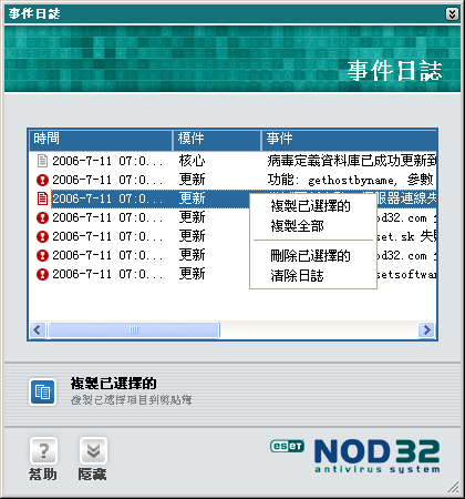 打開ESET NOD32的「控制中心」面板,在「日誌」選項中可以看到它已經默認開啟了「事件日誌」、「病毒日誌」和「掃瞄器日誌」。「事件日誌」會詳細記錄每一次的軟件升級和更新訊息,「病毒日誌」會記錄每一次掃瞄和查殺的病毒訊息,而「掃瞄器日誌」則用來記錄第一次查殺操作的時間和完成狀態等。在它們各自的窗口中除了可以查看外,還可以用右鍵單擊複製或刪除記錄等(如圖)。除了這三項日誌記錄外,我們還可以根據需要手動開啟電子郵件查殺日誌和網絡監視日誌,以完善日誌記錄內容。點擊「IMON」選項打開「網絡監視器」窗口,點擊「設定/其它」選項,鉤選「把企圖入侵的攻擊記錄在病毒日誌中」選框,點擊「確定」按鈕即可。這樣當遭遇網絡惡意攻擊時,就可以通過查看「病毒日誌」使攻擊者現出原形。然後點擊「EMON」選項打開「電子郵件保護」窗口,點擊「設定/日誌」選項,鉤選「記錄所有檔案」選框,接著在「範圍」選框中選擇一個記錄類型,點擊「確定」按鈕即可。這樣對於查殺出的郵件病毒也可以作進一步瞭解了。
