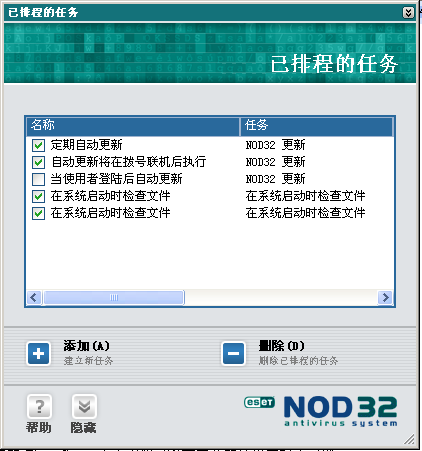 第三步:依次點擊「ESET NOD32系統工具/排程器/計劃器」選項,勾選「自動更新將在撥號聯機後執行」選框,點擊「確定」按鈕即可(如圖)。