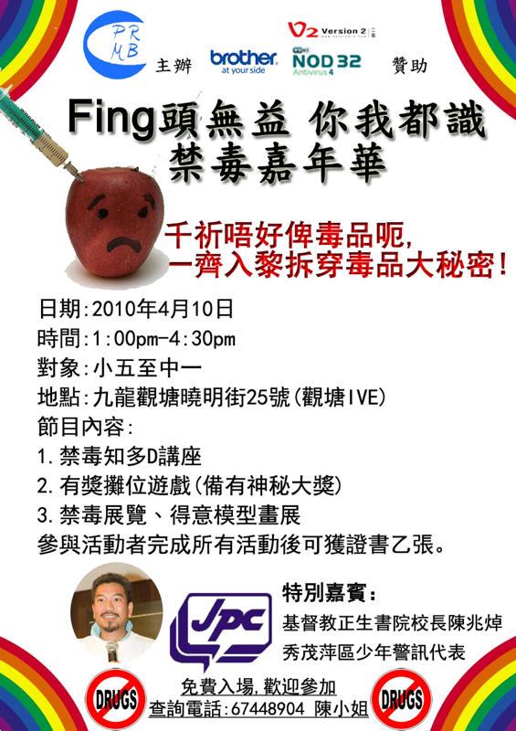 鑑於吸毒問題有日漸年輕化和校園化的趨勢,主辦單位將舉辦一個名為「Fing頭無益 你我都識」禁毒嘉年華,以小五至中一學生為主要對象,由專人講解吸毒的禍害,從而遠離誘惑,活出健康人生。為支持這個富有意義的活動,Version 2 Limited專誠準備了「4 in 1 DVD Package 90日體驗版」以鼓勵年輕人踴躍參加,套裝內包括了ESET NOD 32 Antivirus 4防毒軟件、Zoner Photo Studio11相片編輯軟件、BigLock檔案加密軟件、以及光波24書網之點數卡。